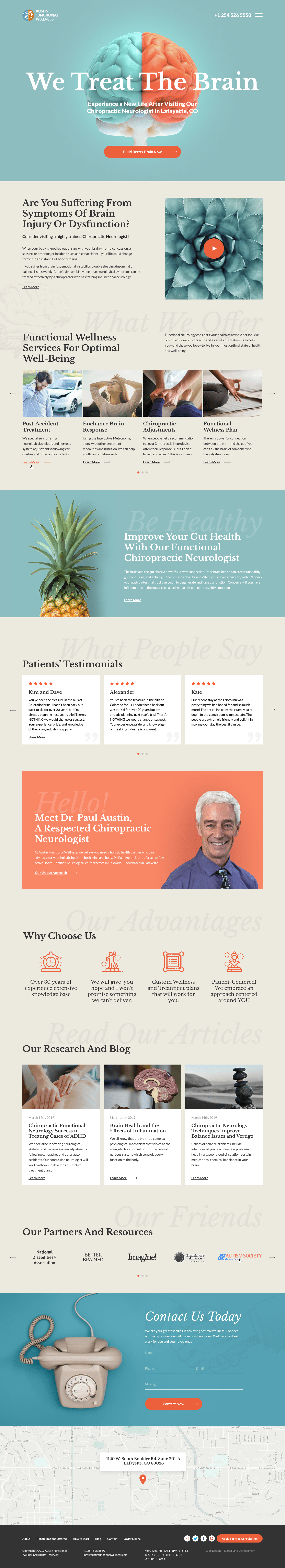 The client is an expert in functional neurology and chiropractic care that investigates the inner workings of our brains and how to heal them. The client requested an informative and at the same time visually pleasant, eye-catching website, that would be convenient and clear even for a clueless visitor. The result was achieved by the combination of colours - muted blues and browns contrasted with bright orange - aesthetically pleasing and easily readable one. At the same time the photos that were added throughout the website make it obvious what the company is all about. That giant brain on the homepage speaks for itself.