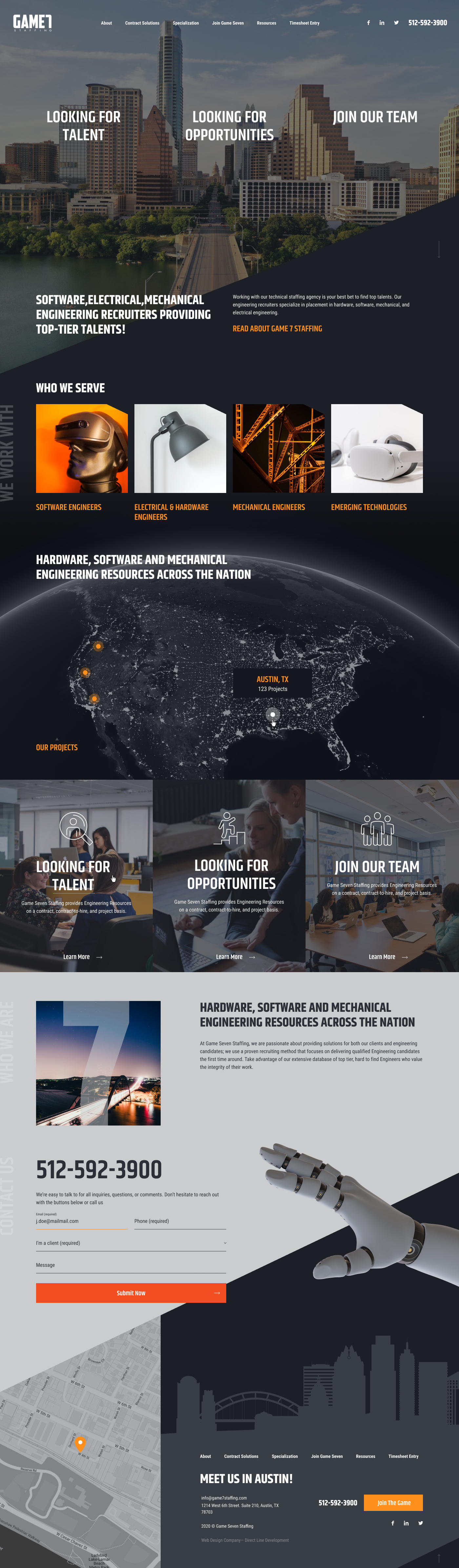 Game 7 Staffing is a staffing agency helping to connect employers with software, electrical, hardware, and mechanical engineering specislists in several industries. They requested an unusual and functional design, that would represent them as a reliable, modern company and at the same time make them stand out. The result was a bold design with a stark colour scheme and multiple useful features.